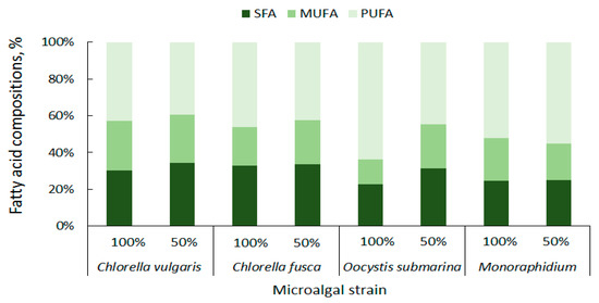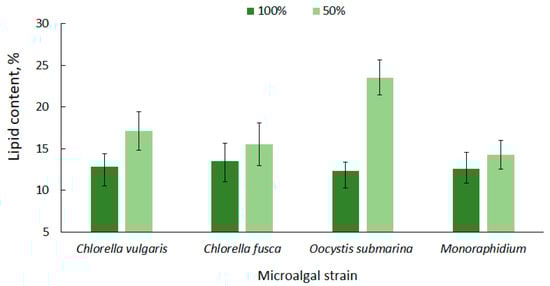 High lipid content in microalgae cells is one of the most important criteria that determines their potential use for biofuel production []. The lipid content for the tested microalgae strains is shown in Figure 2. The average amount of lipids in relation to dry matter, at the complete nutrient dose (100%), ranged from 12.33 ± 1.0 for O. submarina to 13.53 ± 2.1% for C. fusca. A higher lipid content for O. submarina was reported by Klin et al. [], but increase in lipid accumulation could be associated with using a different culture medium and a significantly lower photobioreactor capacity.