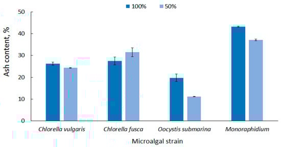 According to the strain, the average ash content in biomass at 100% dose was in the range from 19.74 ± 1.70 for O. submarina) to 43.19 ± 0.24% for Monoraphidium (Figure 3). Similar results were presented by Bi and He [] who found up to 19% ash content for green algae. In this study, the results show that nutrient stress not only promotes lipid accumulation, but generally causes a decrease in ash content in microalgal biomass. In the nutrient-limited medium (50%), ash content ranged from 11.16 ± 0.07% for O. submarina to 37.04 ± 0.38% for Monoraphidium. Increase in ash content was observed only for C. fusca, but it was statistically insignificant difference. The correlation between nutrient content and ash content in microalgal biomass was also reported by Roostaei et al. []. The limited availability of nutrients in Chlorella vulgaris culture significantly decreased ash content.
