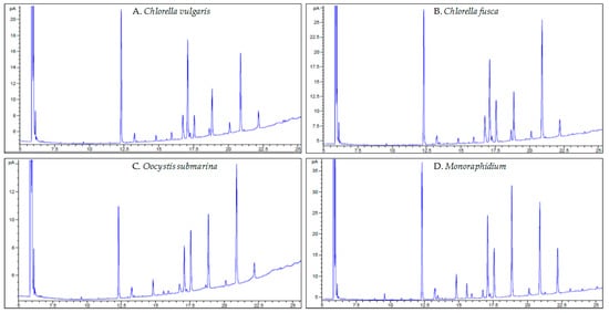 GC-FID chromatograms of fatty acids from particular microalgal strain.