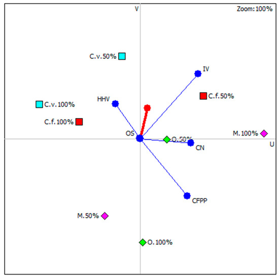 The most important features determining the suitability of a feedstock for biofuel production are its energy properties and parameters indicating the quality of engine combustion []. For biodiesel, these are the heating value (HHV) and the cetane number (CN). In addition, the rheological parameters of biodiesel such as density (D) and kinematic viscosity (KV) are very important, as they have a direct impact on the injection of the fuel inside combustion chamber of the engine [,]. Moreover, these parameters affect the functioning of the diesel engine fuel feed system, especially the fuel filter at low temperatures, resulting in flow blockage, which is characterised by a cold filter plugging point (CFPP) []. During storage of biofuels, their stability is also very significant, as expressed by the parameters of oxidation stability (OS) and iodine number (IV) [].