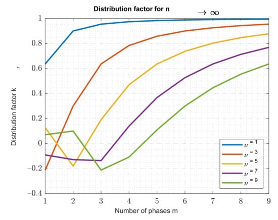 Distribution factor for different numbers of phases and spatial harmonics if n → ∞.