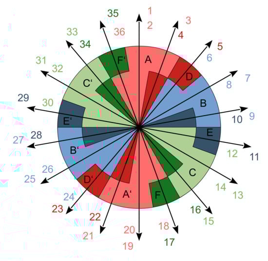 The final phase belts of all mathematical phases of the integer-slot winding are symmetrical and the winding is mathematically described by (8). The phase belts of fractional-slot windings are not fully symmetrical; the fractional-slot winding in Figure 3b (c = 2) has two types of phase belts distinguished for the physical phases (A, B, and C) and mathematical phases (A′, B′, and C′). The same effect can be observed with increasing c.