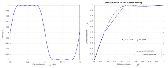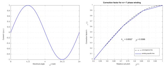 which is used in graphical form in []. It can be proven that, for every number of phases, the correction factor kc is equal to (37) for every relative coil pitch defined by (28). Between these points, the linear interpolation can be used to obtain the value of coefficient kc(m,k). According to [], the maximal relative deviation of the real interpolated function from the idealized cosine function is smaller than 1.5% for the nine-phase winding. Thus, the accuracy is sufficient and (37) can be used for winding with nine and more phases.