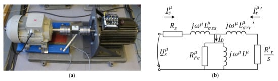 An example of the calculation is shown in the case of the nine-phase induction machine also presented in []. The main parameters of the motor are summarized in Table 3 and the measuring stand of the motor is shown in Figure 8a.