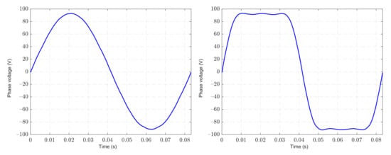 As described in [], the harmonic components injection is usually possible for every concentrated multiphase winding with an odd number of phases. The condition for using higher order time harmonic components injection is that they must create an electromagnetic field that rotates with the same speed as the field generated by the fundamental harmonic component. In the case of concentrated winding this condition is met for every odd time harmonic whose order is less than the number of phases. These harmonics create a μ-times higher number of pole pairs than the fundamental harmonic component, and it is possible to use them for flattening the voltage, magnetic flux, or current waveform to achieve higher torque density without an undesirable increase in noise or vibrations.