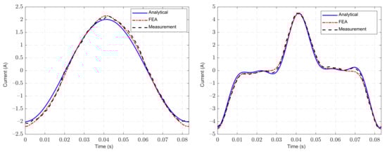 Current waveforms of single and higher order harmonic components injection obtained by analytical calculation, FEA, and measurement.