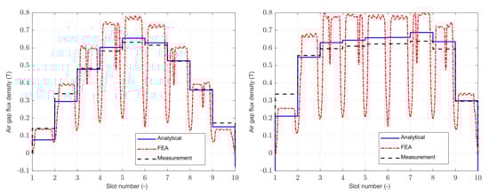 The calculated values of inductances are verified by the no-load current response, and the air gap inductances can be also verified by the comparison of distribution of the air gap flux density. The analytical calculation is based on (8); the machine has an additional testing coil wound on one stator tooth. Based on the measured voltage induced in this coil and calculated flux linkage waveform, the air gap flux density distribution is calculated. The obtained results for both single harmonic and higher order harmonic injection are summarized in Figure 11.