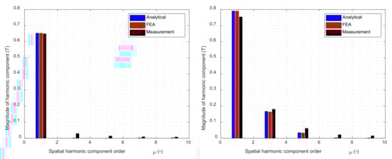 Spectrum of air gap magnetic flux density excited by single and higher order harmonic components injection obtained by analytical calculation, FEA, and measurement.