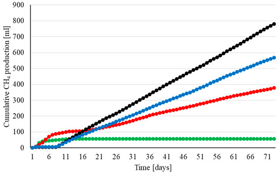 Cumulative biomethane productions in time from 20 mL nominal H2 volume (=18.0 v/v% H2, red curve), 40 mL nominal H2 volume (=31.5 v/v% H2, blue curve) and 60 mL nominal H2 volume (= 43.5 v/v% H2, black curve) and concomitant stoichiometric CO2. The control, i.e., only daily N2 gas replacement of the head-space, is shown in green. The symbol sizes indicate the error of measurement.