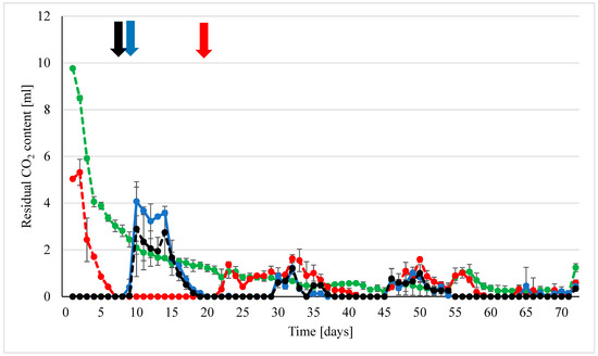 The residual CO2 levels measured in the reactors’ head-space. Color codes as in Figure 1: green = control reactors, red = low H2 daily dosage (20 mL H2 nominal volume), blue = medium H2 daily dosage (40 mL H2 nominal volume), black = high daily H2 dosage (60 mL H2 nominal volume). The arrows indicate the time points when excess CO2 was delivered in order to remedy system imbalance.