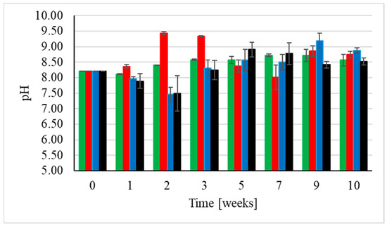 This effectively restored CH4 production, although the excess CO2 supply resulted in a transient accumulation of CO2 in the headspace. Henceforth, a 4:1 volumetric mixture of H2 and CO2 was injected daily into the head-space of the reactors. Steady CH4 production, without detectable H2 or CO2, was maintained throughout the rest of the 71-day long experiment, demonstrating sustainable bioconversion of H2/CO2 to CH4. The alterations in the pH of the reactor content reflected and corroborated the postulated sequence of events. Following week 2, a significant pH elevation was noted in the reactors receiving 18 v/v% of H2, which quickly reached an alarming level above pH = 9 (Figure 3) on weeks 2 and 3. The injection of CO2 slowly returned the pH level to normal, corroborating the essential role of CO2/HCO3− in maintaining and regulating the buffering capacity in these systems.