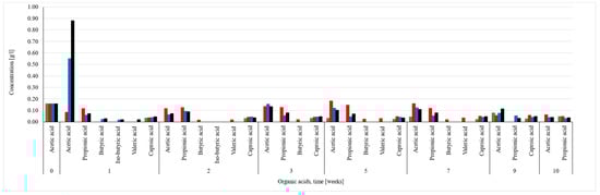 The concentrations of volatile organic acids were measured with HPLC (Hitachi Chromaster) equipped with a refractive index detector Chromaster 5450. The separation was performed on an Agilent Hi-Plex H column. The temperature of the column and detector were 50 °C and 41 °C, respectively. The eluent was 0.02 M H2SO4 (0.6 mL·min−1).