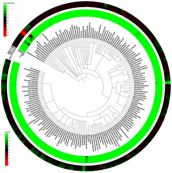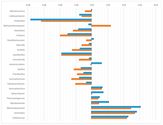 The regulatory effects of H2 and/or H2/CO2, together with the lack of added organic substrates, manifested themselves in the genera Ureibacillus (log2FC= −7.6), Lutispora (log2FC= −3.9), Herbinix (log2FC= 2.4), Clostridium (log2FC= −2.3), Bacillus (log2FC= −1.3), Tepidanaerobacter (log2FC= −2.0) among Bacteria. Ureibacilli have been found frequently in thermophilic aerobic poultry waste treatment sites [51]. Similarly, the genera Lysinobacillus and Paenibacillus are typical components of the poultry manure microbiota [52,53]. These apparently “outlier” bacteria (taxon names are highlighted in yellow in Table 1) could have therefore infiltrated the thermophilic AD community from the AD substrate, which contained poultry meat processing waste (Figure 6).