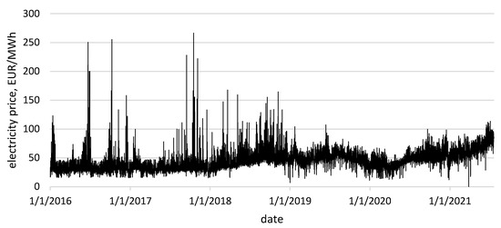 In Polish conditions, energy prices fluctuate on an hourly basis at most, and e.g., in Germany on a 15-min basis. The main electricity trading market in Poland is Towarowa Giełda Energii—TGE (Polish Power Exchange), and the primary measure (largest volume) of prices on an hourly basis is the day-ahead market (DAM). Historical DAM prices from the beginning of 2016 are presented in Figure 3.