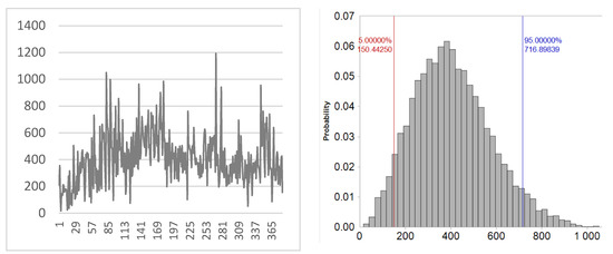 Figure 6 presents changeability of the economic effect (profit) for approx. 380 observations, in the July 2020–July 2021 perspective. The right side of this figure is a histogram-the distribution of economic effects converted into 365 days a year. It can be seen that there are 90% of all observations between 150 Euro and 716 Euro. The average value was 401 EUR. It can also be seen (left side of Figure 6) that the economic effect is of high periodic changeability, resulting from the difference between the minimum and maximum market energy prices.