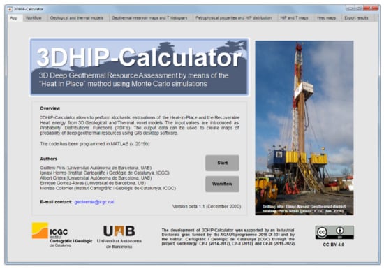 The 3DHIP-Calculator (Figure 1) was developed using MATLAB ® (v. R2019b) [44] based on the MATLAB App Designer, and then compiled for Windows as a standalone application. The installation files, as well as the user manual and examples, can be freely downloaded from the “Deep geothermal energy” web page of the Institut Cartogràfic i Geològic de Catalunya (ICGC) (under the Creative Commons license Attribution 4.0 International, CC BY 4.0). The source code can also be downloaded from https://github.com/OpenICGC/3DHIP-Calculator (accessed on 15 October 2021).
