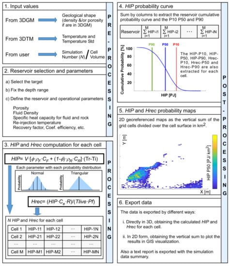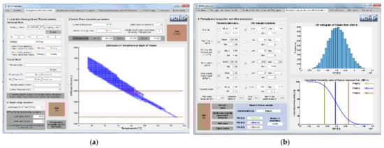 An easy-to-use graphical user interface (GUI) was implemented and organized in six main steps, as shown in the workflow of Figure 2. The first part comprises the pre-processing step, that includes the selection of input parameters (step 1 in Figure 2). In this step, the input 3D geological and 3D thermal models (referred to as 3DGM and 3DTM, respectively) are converted to a matrix, where each row corresponds to one voxel in the 3D model and the columns are the petrophysical/reservoir parameters. Using depth ranges and geological units, the target volume of the whole model is defined. The parameters that are not included as initial data in the 3D models are defined using PDFs (2, Figure 2).