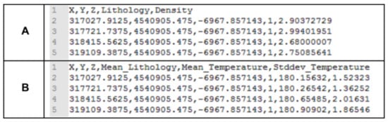 The 3DGM and 3DTM files should follow certain rules in terms of data organization (e.g., Figure 3). Particularly, they need to include at least one line of column headers before listing the data. The file is organized in a way that each column contains a variable, and each line corresponds to a voxel. The columns normally correspond to (in this order): voxel coordinates (X, Y, and Z, usually corresponding to its centroid) in UTM or geographic coordinates in decimal degrees, and a numerical identifier to differentiate the geological units (e.g., lithology, formation, reservoir, target, etc.). Additionally, the 3DGM can contain petrophysical parameters such as density (in g/cm3) and porosity (parts per unit) that can vary for each voxel. The 3DTM should include the voxel coordinates (X, Y, and Z), the temperature (in °C), and the temperature standard deviation (in °C) for each voxel. The temperature standard deviation is an optional parameter that can be set to zero if it is unknown. Furthermore, the voxel position and resolution (in X, Y, and Z) of the geological and thermal models must be identical and match each other.