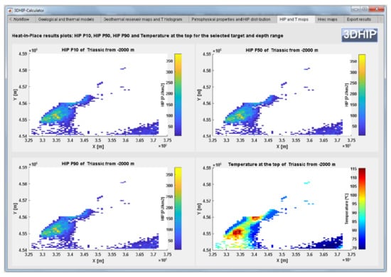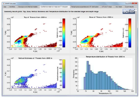 The 3DHIP-Calculator application has many competitive advantages. Firstly, the source code and the installation files are accessible for all users and developers from open-source repositories such as GitHub. Secondly, as the tool allows importing 3D models that integrate previously generated geological, petrophysical, and thermal data, it considers the whole geological heterogeneity of the reservoir to estimate the geothermal potential using the HIP method. Finally, the results can be exported in ASCII format for their subsequent post-processing in other environments, such as GIS software packages. This allows generating maps of the assessed deep geothermal potential at the regional scale, and to use 3D visualization tools and statistical packages, such as R [33], for further evaluations. All these advantages open a wide range of possibilities, including the construction of GIS-based maps or to conduct feasibility studies of the deep geothermal potential through risk analysis approaches.