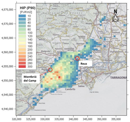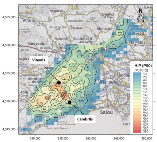 The HIP and Hrec results are displayed in a georeferenced map (Figure 11) to provide a background of geographical context, and this allows for further analysis. The highest values (260–300 PJ/km2) were observed southwest of the basin, concentrated around the town of Vinyols. However, in this scenario, the estimation of HIP values was sensibly lower than those of the previous example. This is because the 3DTM mean gradient is lower than that of the previous scenario.