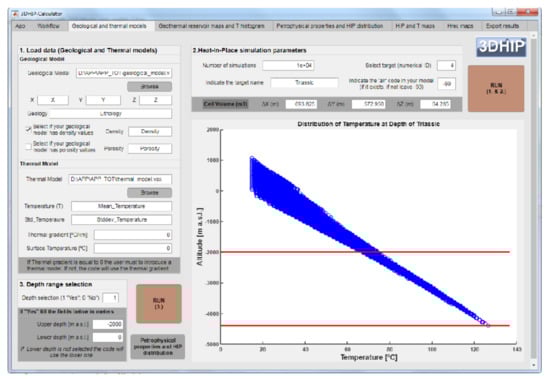 After uploading the 3DGM and providing an input value for the geothermal gradient (30 °C/km), a total of N = 10,000 realizations were carried out. This number of simulations is accepted by different authors as high enough for Monte Carlo evaluations [4,19,27,43]. For this example, we considered the Triassic unit as the geothermal target reservoir.