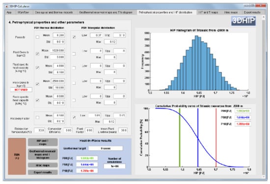 Since the geological and thermal models are simplified to a single voxel, it is necessary to determine the total target reservoir volume in the calculations. The petrophysical and operational properties are introduced to indicate the corresponding triangular or normal distribution functions (Table 1). The results generated by the 3DHIP-Calculator tool are limited to the HIP histogram and the CDFs with the corresponding P10, P50, and P90 for the entire target (such as shown in Figure 5b for example 2).