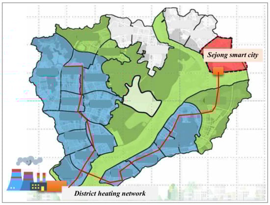 Studies have also been conducted on measures to apply various hybrid renewable energy systems (HRESs) to cities []. In particular, because grid parity can be reached when self-sufficiency exceeds 40% due to the installation of PV systems, increasing the energy supply from renewable energy sources through the application of various energy storage and conversion systems is required []. In addition, power storage methods such as batteries, as well as the application of renewable energy for heat, are required. District heating has long been applied in various ways to utilize the urban heat island problem and has the benefits of increased heat supply efficiency and reduction of particulate matter []. Recently, various efforts have been made to increase the renewable energy share of thermal energy in addition to electricity. In particular, interest in the application of renewable energy to fourth generation district heating has been increasing [,]. Methods of utilizing electricity, as well as renewable thermal energy and various waste heat sources based on the district heating network, are also important technologies to reduce national carbon emissions by implementing a low carbon emission city. In Europe, district heating is expected to play an important role in reducing carbon emissions in cities in a cost-effective manner [,].