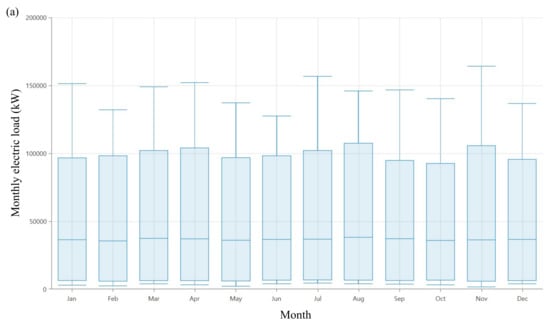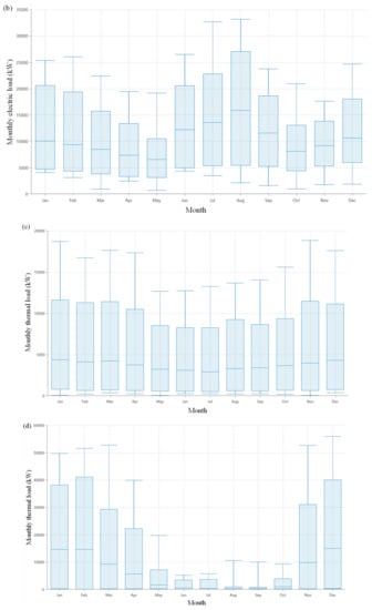 Monthly electric and thermal loads of the Sejong national pilot smart city: (a) electric load of residential buildings, (b) electric load of commercial buildings, (c) thermal load of residential buildings, (d) thermal load of commercial buildings.