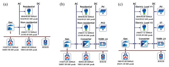 As mentioned above, the electricity and thermal energy loads of the residential and nonresidential buildings in the Sejong smart city were derived. The total floor areas of the residential and nonresidential buildings were 884,648 and 1,214,300 m2, respectively, showing that the latter occupied a larger area []. As shown in Figure 4, the electricity, hot water supply, and heating loads of the residential and nonresidential buildings were calculated. The daily average electric load and peak electric load of the buildings are shown in Table 1.