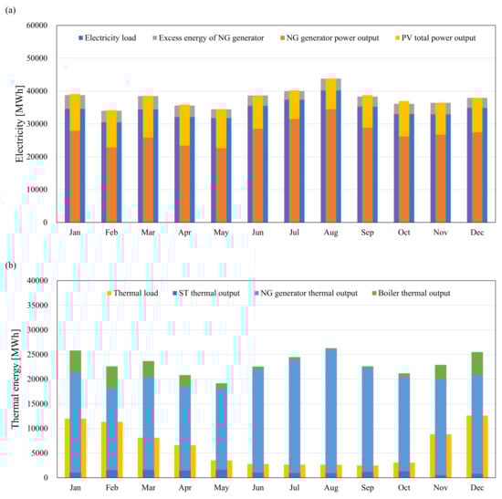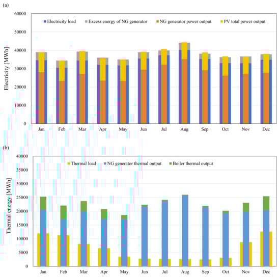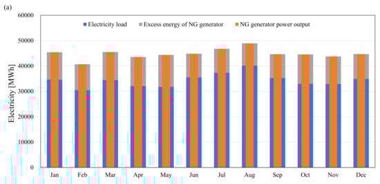 In the base case, an NG generator supplied electricity and thermal energy in the Sejong smart city (Figure 6). The simulation results showed that a capacity of 220 MW was required for NG to supply 100% electricity and heat in the city. In this instance, the NG generator provided 412 GWh, which is the annual electric load of the entire city, and it had to produce 23.3% additional electricity to meet the minimum operation rate of 40%. This required a total electricity production of 539 GWh.