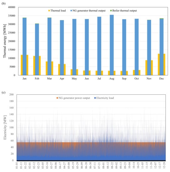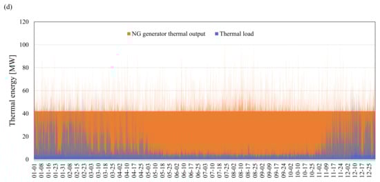 During this electricity generation, thermal energy was also produced, and the total thermal energy produced by the NG generator and boiler was found to be 398 GWh. This corresponded to 517% of 77 GWh, which is the total heating and hot water supply load. However, most of the surplus heat was generated in summer. Despite this heat production, it was found that 1 GWh, which is 0.3% of the total thermal load, must be supplied through the gas boiler due to the imbalance in heat supply in the absence of electricity consumption.