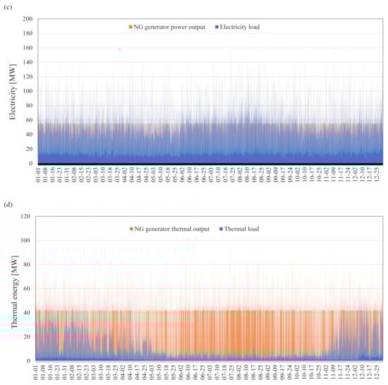 Operating profile of NG generator in the base case: (a) monthly electricity balance, (b) monthly thermal balance, (c) hourly electricity balance, (d) hourly thermal balance.