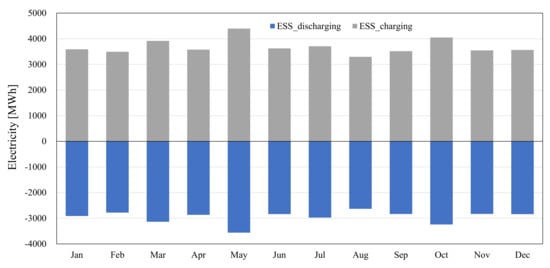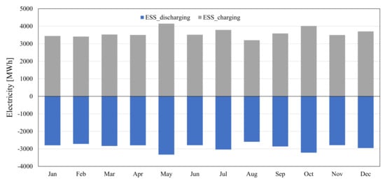 As shown in Figure 7, in Case 1, analysis was conducted for the case in which an NG generator supplied electricity and thermal energy in the Sejong smart city, and PV and ESS systems were installed on building roofs and in empty spaces. The simulation results showed that the NG generator required a capacity of 220 MW as in the base case. This is because there are many periods in which the PV systems cannot perform power generation under the significant influence of weather, and electricity must be supplied in winter, when solar radiation is low. To meet the electric load of the entire city (i.e., 412 GWh), a total of 481 GWh was produced and a surplus electricity of 69 GWh was generated. Of the total power generation, the NG generator provided 333 GWh (69.1%), the PV systems installed on the building roofs provided 143 GWh (29.7%), and the PV systems installed in the empty spaces provided 6 GWh (1.2%). Of the total surplus electricity of 69 GWh, 17 GWh was stored in the ESS and then used to meet the electric load of the city, and the remaining 52 GWh was retained as surplus electricity. In Case 1, the optimized ESS capacity was calculated to be 239 MWh, and the surplus electricity from the NG generator or PV systems was stored in the ESS and then supplied to the city as shown in Figure 8. The electricity stored per year was 42 GWh and 34 GWh was used. Thus, the loss was calculated to be 8 GWh.