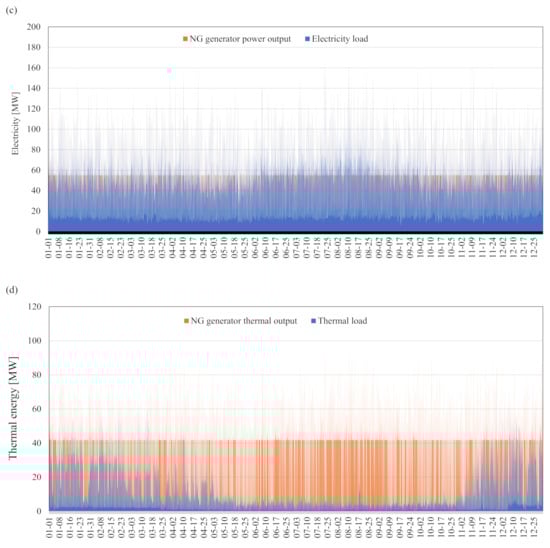 Operation profile of NG generator in base case: (a) monthly electricity balance, (b) monthly thermal balance, (c) hourly electricity balance, (d) hourly thermal balance.