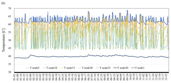 In Case 2, ST systems were installed in empty spaces, and the heat produced by the ST systems was stored in the TES and then supplied through the thermal network. As shown in Figure 11, the total thermal energy produced through the ST systems was 15 GWh. The efficiency of the TES was approximately 95%, and the amount of heat released by it was 14 GWh. In Figure 11b, the internal temperature of the TES was divided into 30 nodes from the top (i.e., Node 1) to the bottom (i.e., Node 30). The operation status can be identified through the temperature of each node. When the internal temperature of the TES was increased to 60 °C through solar heat collection, heat was supplied through the thermal network.