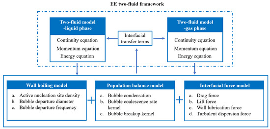 Generally, the wall boiling coupled with the PBM model in the EE two-fluid framework for the gas-liquid flow is shown in Figure 1. It consists of the two-fluid model, wall boiling model, PBM kernel and interfacial force model [2,33] which will be described as follows.