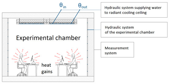 The tests were conducted in an experimental chamber with dimensions 4.7 × 4.1 × 3.0 m (W × L × H), which provided a stable partition temperature. The walls were insulated with expanded polystyrene (thickness: 0.1 m) with the following parameters: density ρ = 30 kg/m3, specific heat capacity cp = 1.45 kJ/(kg∙K), and thermal conductivity λ = 0.04 W/(m∙K). The test stand consisted of the hydraulic system of the experimental chamber, the hydraulic system supplying water to the radiant cooling ceiling, and the measurement system processing and collecting data; each independent of each other. The structure of the test stand is depicted in Figure 1. A full description of the test stand and the experimental results of the phase change material are detailed in [42].