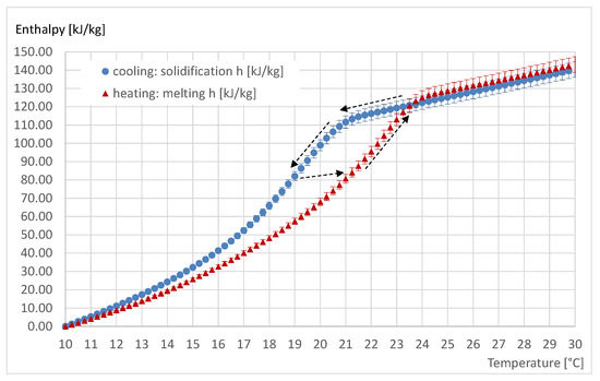 The applied filling of the thermally activated panels was silica powder into which paraffin constituting 60% of the mixture was introduced (by impregnation). It was characterized by stability and chemical inertness and showed little volume change during phase change. The powder was filled in the entire volume inside the cooling panels mounted in the experimental chamber (Figure 3), and its total mass was 72 kg. The phase change temperature range was adjusted to the operating temperature of the thermally activated ceiling without PCM filling to achieve as large as possible a temperature difference between the ceiling surface and the room air temperature during passive cooling, while providing thermal comfort and preventing condensation of water vapor from the air in the room. In the temperature range of 18–25 °C, a 5 cm layer has the same thermal capacity as a 16 cm reinforced concrete ceiling [42]. Partial enthalpy of PCM in modules is presented in Figure 4.