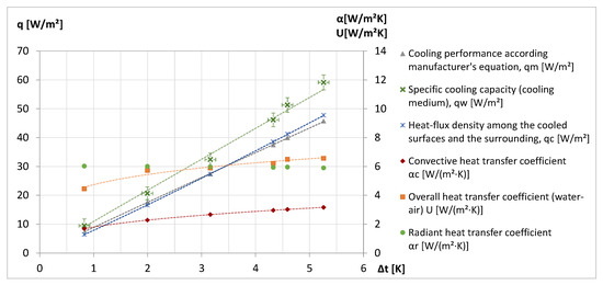 Steady-state tests included cooling modes of the thermally activated panel without PCM. The room temperature was maintained at 29.5 °C (±0.5 K). The purpose was to determine the operating parameters. Figure 5 shows the specific cooling power, heat transfer coefficients at the panel surface, and the overall heat transfer coefficient (U) between the cooling medium (water) and the air. The specific cooling power resulting from the difference in water temperature (qw), the cooling power resulting from the difference in temperature between the ceiling surface and ambient air using Nusselt number (qc), and the characteristic equation of the cooling panel developed by the manufacturer (qm) were calculated.