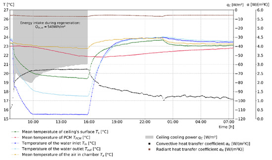 Thermal activation of ceiling () was performed at night (from “start” to “stop”) and the energy intake during regeneration (water side) was calculated as follows: