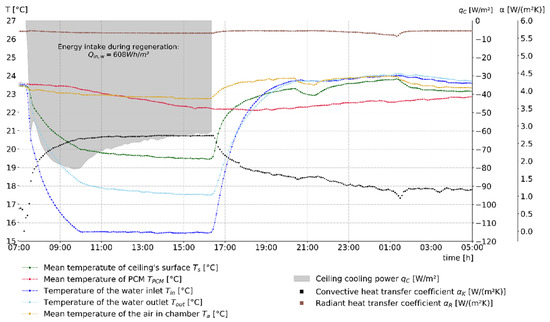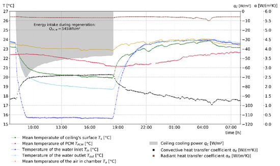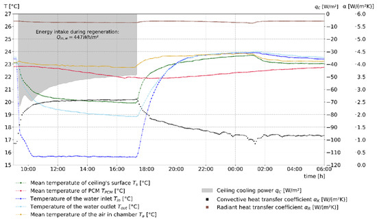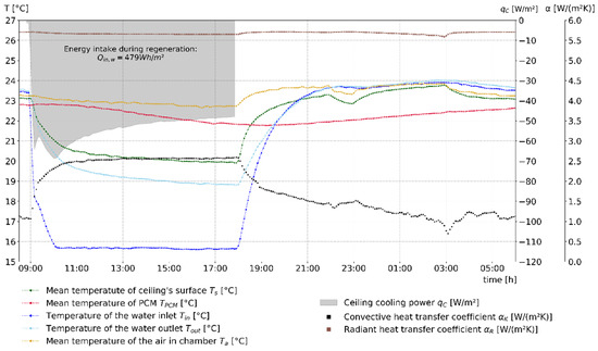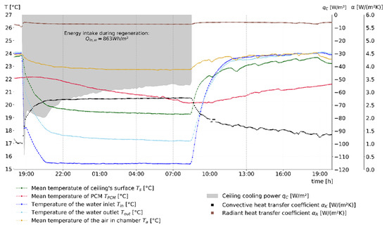 The purpose of the study was to determine the momentary specific cooling power depending on the supply water temperature (Tin), the return water temperature of the cooling ceiling (Tout), the water mass flow during regeneration (), and the total energy supplied to the cooling ceiling during regeneration of the phase change material. Convective heat flux density, radiant heat flux density, and the heat transfer coefficient (convective, radiant) at the ceiling surface were calculated.