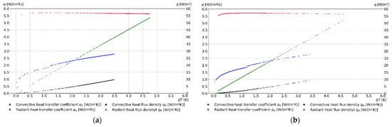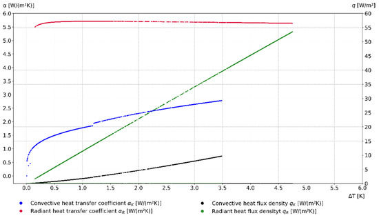 Table 3 presents the heat transfer coefficient and heat flux density as function of temperature difference between a thermally activated surface and air (convection, ) or non-activated surfaces (radiation, ).