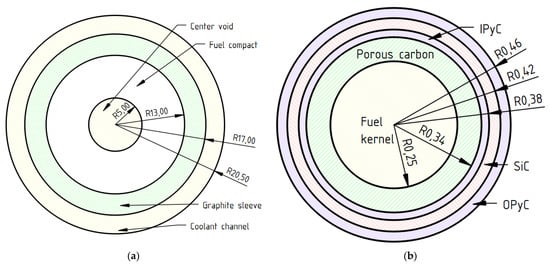 Analysis was performed using the internal coupling of the Monte Carlo burnup (MCB) code [3,4] with the upgraded thermal–hydraulic code POKE [5]. This Monte Carlo burnup calculation system has been developed and applied to Gen-IV reactors, including HTGRs [6,7,8]. The model is based on the HTGR design, referred to as Go_HTR [9], that was developed in the Polish national research program on HTR industrial applications as a heat source. The core design used in current studies is based on the fuel rod and block structure designed by the Japan Atomic Energy Research Institute (JAERI) [10], where fuel rods are surrounded by a graphite sleeve and inserted into a cooling channel. A special feature of the Go_HTR design is the implementation of half-fuel blocks. Those blocks contain CR holes and four rows of fuel compacts instead of seven. They are located in the outermost ring of fuel blocks and serve to make the shape of the active core more cylindrical. Helium is used as the coolant. The detailed structures of fuel rods and TRISO particles are shown in Figure 1. In the current article, we did not address the mechanical design of innovative control rods but the nuclear analysis of their work and the impact on the characteristics of the core of a high-temperature reactor. In the mechanical design, mechanisms and configuration will have to be carried out to ensure the insertion of the telescopic structure of the control rods.