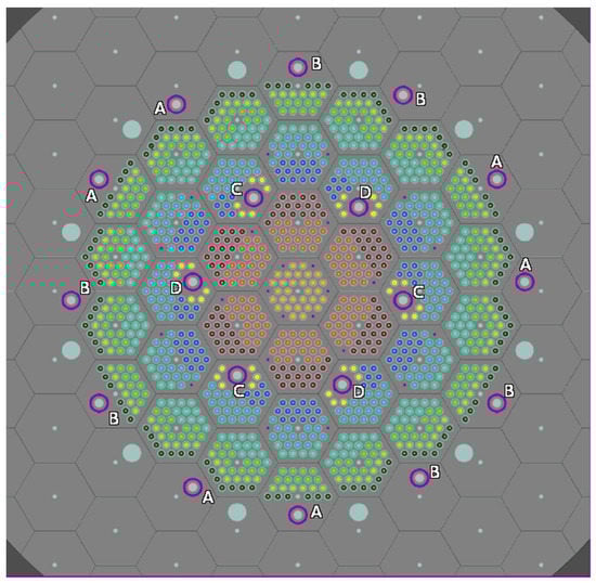 The radial configuration of the reactor core is presented in Figure 2. The letters A, B, C, and D visible in the figure refer to the control rod groups. The numbering of the radial zones starts from the innermost zone 1 (dark yellow rods) and ends with the outermost zone 9 (dark green rods). The exception is a special zone consisting of rods (light yellow) surrounding inner control rods.