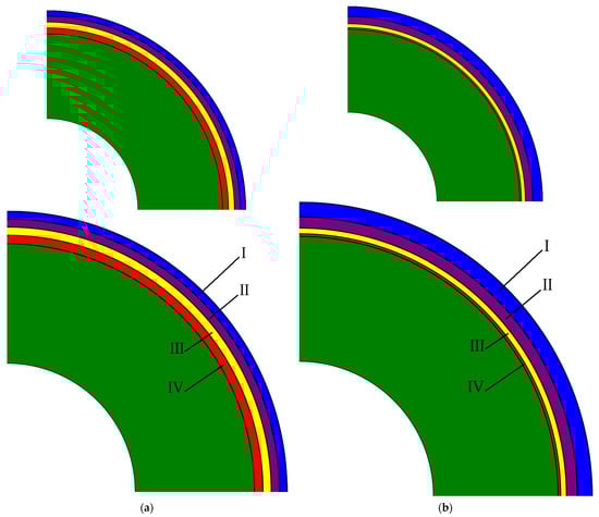 Visualization of the volumetric fractions of the radial layers of the control rods: (a) St_struc, equal volumes; (b) St_opt, optimized structure. The innermost central section (green) is made of B4C dispersed in graphite, while the others are made of tungsten.