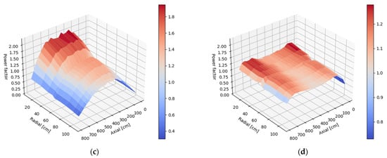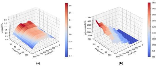 It is confirmed by the radial distribution parameter calculated according to Equation (2), which in this case is 0.92, and the axial parameter is 1.02, which means that the distribution is slightly tilted downward. One can observe a decrease in the power density in the radius of 55 cm, which is a result of the presence of control rods in the active core. Further effort was put into flattening the power distribution by operating the radial layers of the control rods.
