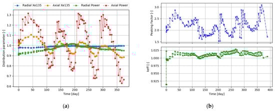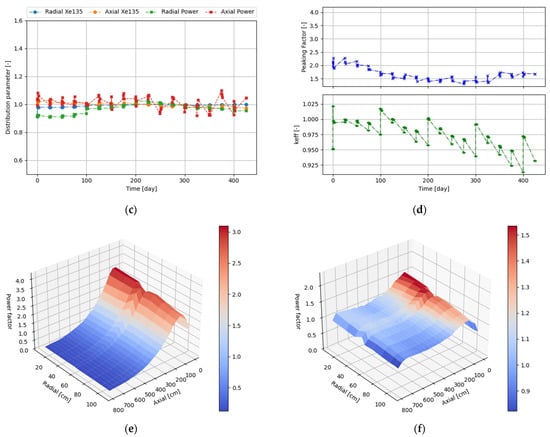 In Figure 5a, it can be seen that the removal of the absorber from the bottom part of the core causes a tilt of the power distribution and a concentration of Xe135 in the bottom part. As the withdrawal of the control rods proceeds, the power profile tilts in the opposite way, and with each control rod group, the tilt is enhanced. When comparing Figure 4a and Figure 5b, it can be derived that the more tilted the power profile is, the higher is the peaking factor. The application of the structured control rods significantly reduced the change in the power and xenon profiles in the axial direction, as well as peaking factors, as seen in Figure 5c,d. It can be inferred that the radial power profile flattens as the outer control rods are removed, but later it becomes tilted again toward the core center as the inner control rods are withdrawn. This seems to be also confirmed by the behavior of the total peaking factor, as it keeps a minimal level, and the radial power oscillation is closest to value 1. However, it should be noted that closer to the end of the cycle, the withdrawal of the last CR sections caused larger changes in reactivity and distribution parameters than at the beginning of the cycle. This applies to both strategies, but for the simpler St_solid, the effect is that the power distribution axial swing is much stronger. Figure 5e,f provide a visualization of the significance of the distribution parameter, where the axial distribution parameters are 0.55 and 0.95, respectively. The maximum power factor in the St_solid strategy oscillates, increasing along burnup, and reaches a level of 4.0, whereas in the St_struc strategy, it floats below 2.3 after peaking at beginning of live (BOL). However, the above results were obtained in some way too simplified timestep scheme, which generates some biases. A better timestep scheme is needed—first in order to narrow the margin of calculated criticality level, and second, to increase the number of steps for the case of structure rods in order to calculate distribution parameters also in the time point when CR sections are partially withdrawn.