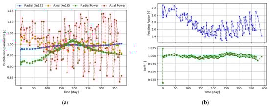 Result of operation strategy St_solid, in refined timestep simulation: (a) distribution parameters; (b) total peaking factor (top) and evolution of Keff (bottom).