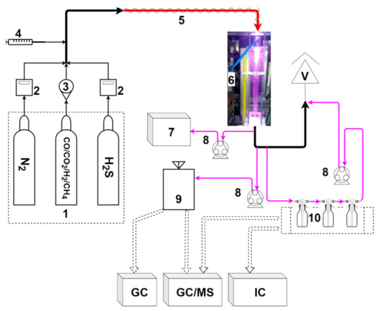 Experimental setup: 1—gas cylinders; 2—mass flow controller; 3—rotameter; 4—syringe pump; 5—heated hose; 6—microwave plasma reactor; 7—gas analyzer; 8—peristaltic pump; 9—Tedlar bag; 10—impinger bottles; V—vent; GC—gas chromatograph; MS—mass spectrometer; and IC—ion chromatograph.