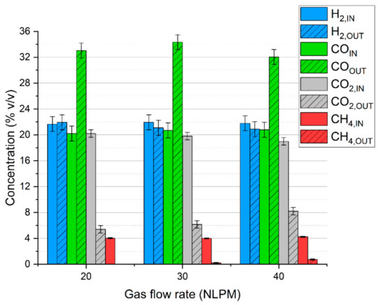 Consequently, as presented in Figure 2, the share of carbon monoxide is significantly increased at the cost of carbon dioxide and methane, while the concentration of hydrogen is rather stable. Within the investigated range, the gas composition is only slightly affected by the gas flow rate.